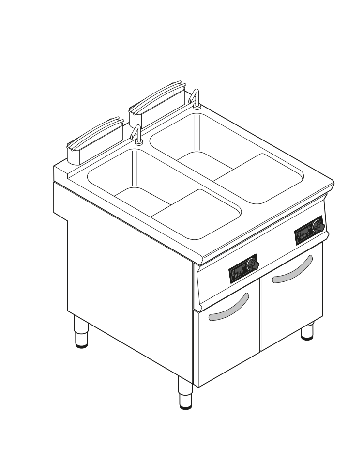 Cuocipasta elettrico con controllo elettronico 40+40 L GN1/1 con 2 vasche freestanding su vano chiuso da 80 cm.