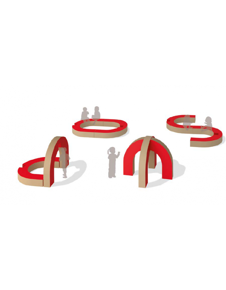 Un gioco per scoprire il passaggio dalle due alle tre dimensioni. È formato da due pezzi ad arco, che appoggiati al suolo delimitano uno spazio o compongono una panca a forma di serpente e collocati in verticale costruiscono portali. Incastrati tra loro diventano la struttura spaziale di una cupola, un telaio aperto che definisce uno spazio nel quale si può entrare.