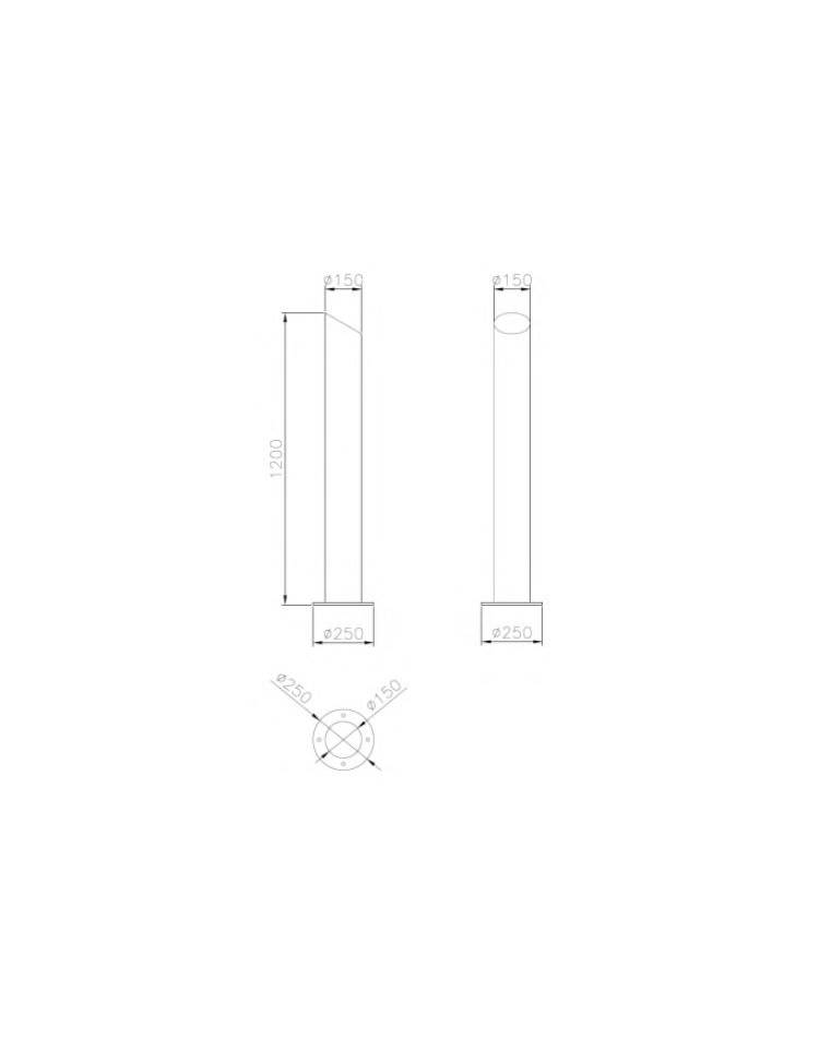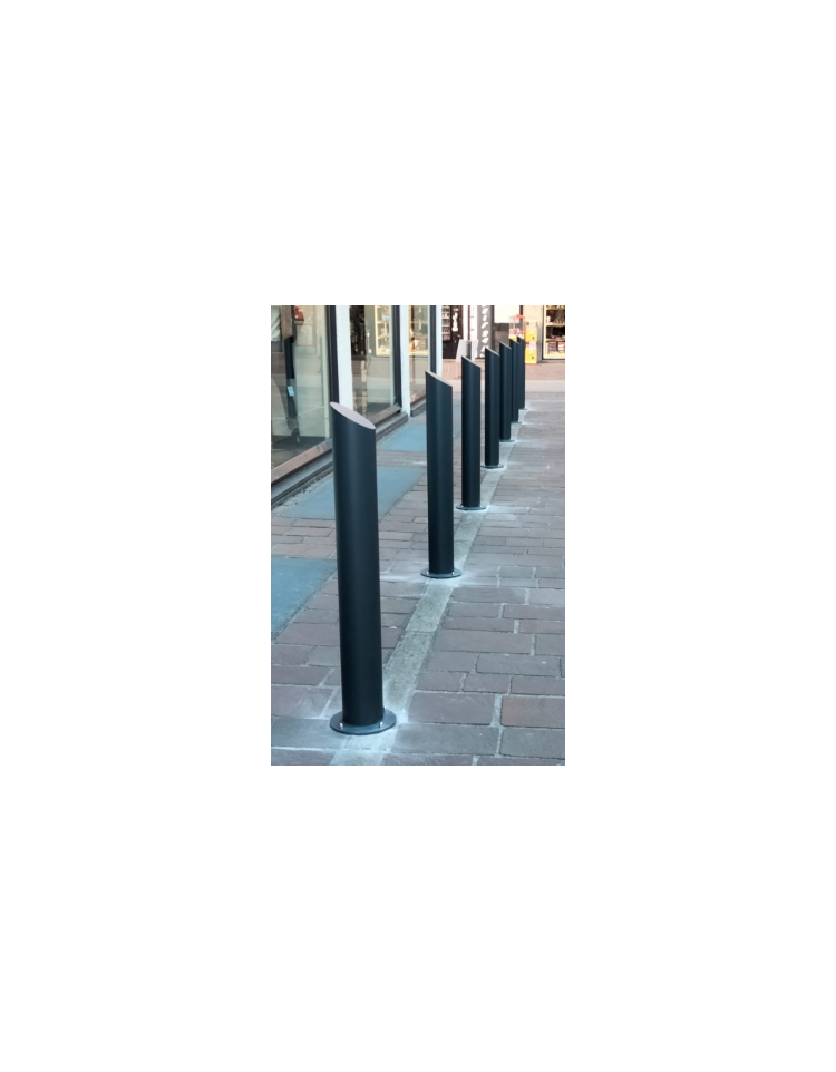 Dissuasore amovibile in acciaio zincato e verniciato di altezza 1200 mm realizzato in tubolare D. 219 mm chiuso all’estremità superiore da una lamiera in acciaio sagomata al laser e saldata al tubolare. Il dissuasore è fornito con boccola con chiave in acciaio zincato. La parte superiore è inclinata.