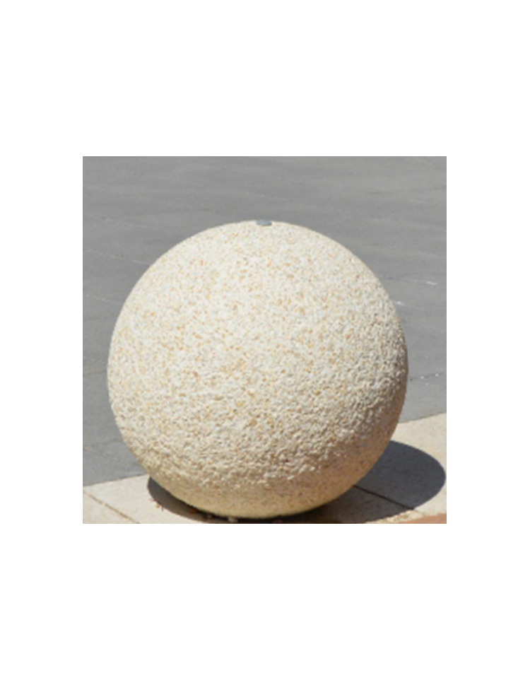 Dissuasore di forma sferica, realizzato in graniglia di marmo con acciaio zigrinato e zincato; l’impasto è composto da cemento, graniglia di marmo a granulometria studiata, fibre sintetiche, additivi superfluidificanti per ridurre il rapporto acqua/cemento, e gettato in casseforme vibrate ad alta frequenza. La superficie è bocciardata, sempre rifinita a regola d’arte. Questo tipo di dissuasore deve necessariamente essere fissato al suolo.