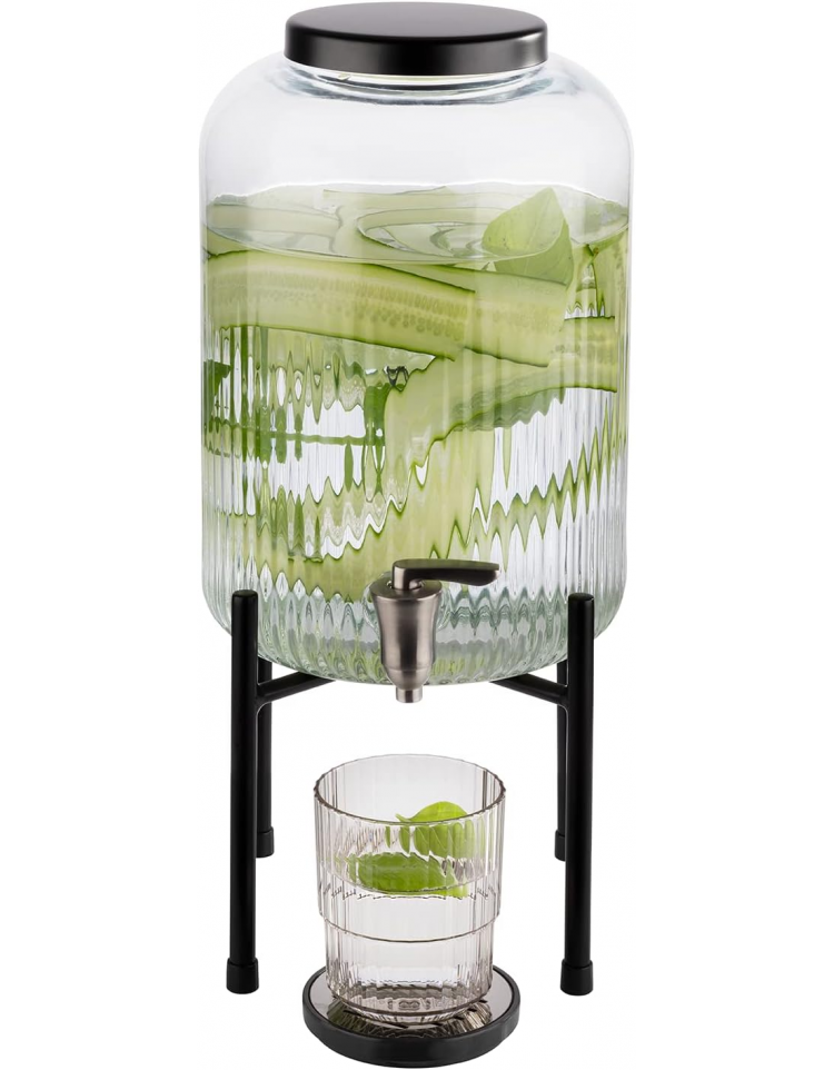 Distributore di bevande in vetro con rubinetto inox e base e coperchio in metallo nero