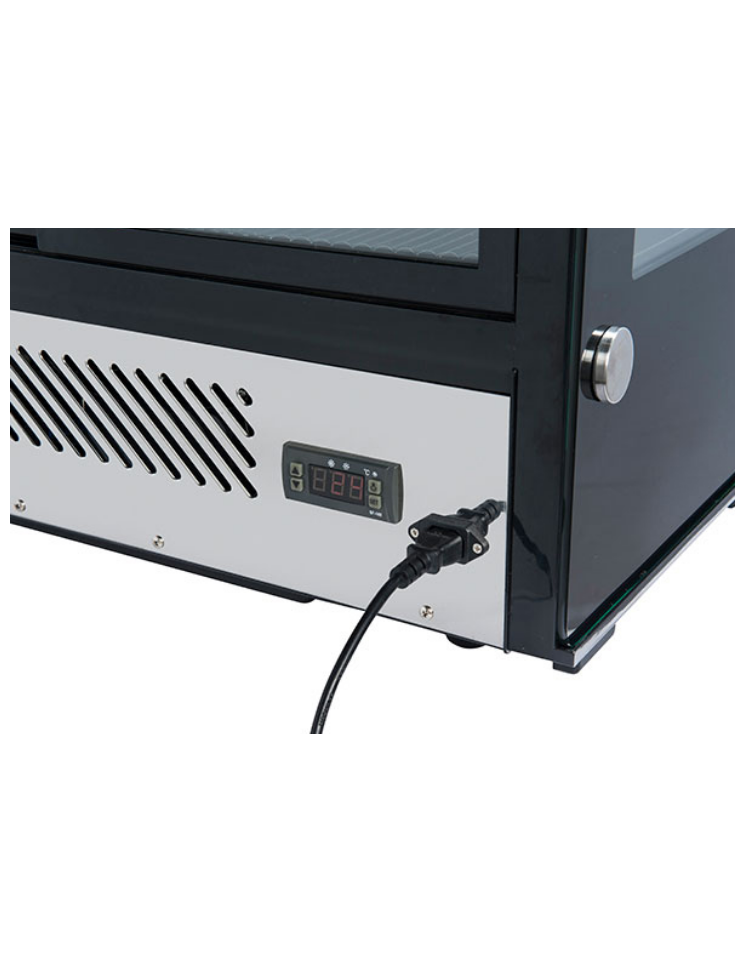 Espositore refrigerato da banco, vetro quadrato con cornice nero e basamento inox - ventilato +1/+12°C - cm 88x57x68,5h