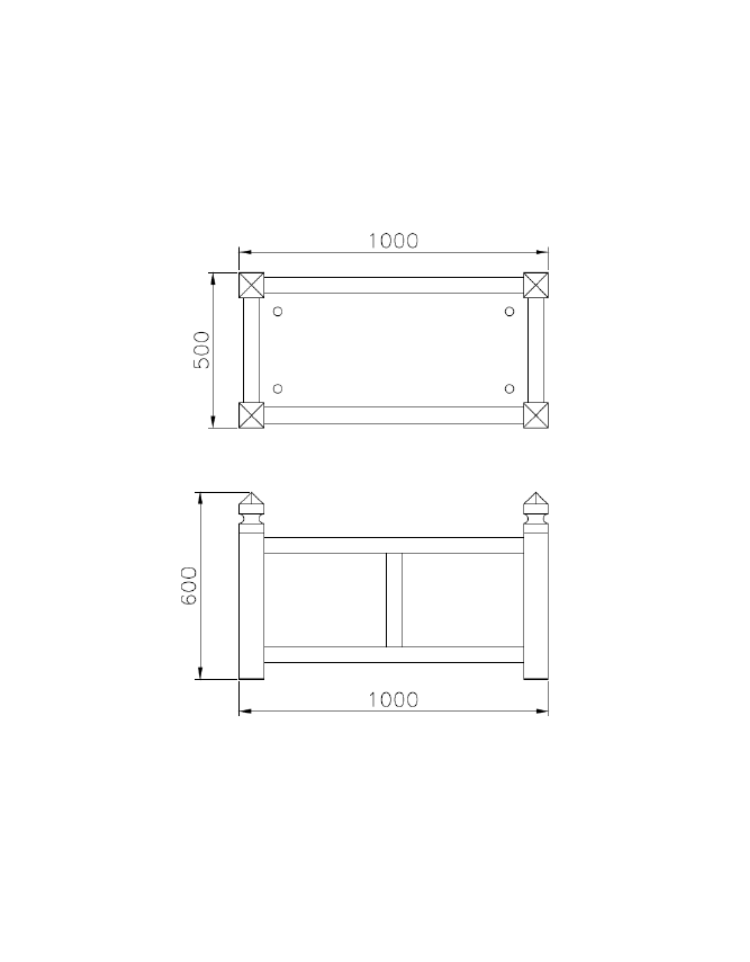 Fioriera a forma rettangolare in tubolare quadro con decori, ricavati da torneria e traversi in tubo quadro - cm 100x50x60h