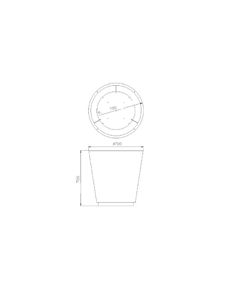 Fioriera realizzata da uno scatolato in lamiera tagliata al laser e piegata. La parte superiore è ricavata dalla piega della lamiera e crea una cornice. Il fondo in lamiera è fissato alle pareti tramite saldatura, inoltre ha saldato nella parte inferiore un base per rialzare il tutto. Tutte le parti metalliche sono zincate e verniciate a polveri poliestere termoindurenti secondo le colorazioni RAL. Dotata di fori di scolo per l’eliminazione dell’eccesso d’acqua. Molto robusta, adatta per proteggere con arbusti piazze o zone pedonali urbane. Le dimensioni si riferiscono alla parte superiore (ingombro massimo). Disegno all’ordine