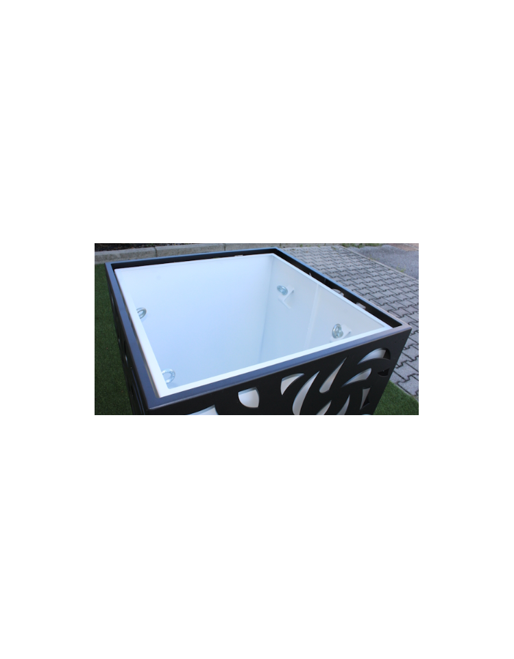 Fioriera di desing in acciaio zincato e verniciato - con contenitore interno. La fioriera è composta da una struttura esterna e, su richiesta, da un contenitore interno, entrambi realizzati completamente in acciaio. La struttura è realizzata in lamiera piegata e con fondo forato per lo scolo delle acque superflue e piovane. Nei lati sono presenti delle decorazioni ricavate durante il taglio laser della lamiera. Il fondo, anch’esso in lamiera, è saldato alle pareti e ha nella parte inferiore un telaio saldato fatto con piatto, che serve a sollevarlo da terra. Il contenitore interno è anch’esso realizzato in lamiera piegata e forata nel fondo per lo scolo delle acque in eccesso. Tutte le parti metalliche sono zincate e verniciate a polveri poliestere termoindurenti secondo le colorazioni RAL. Dotata di fori di scolo per l’eliminazione dell’eccesso d’acqua.