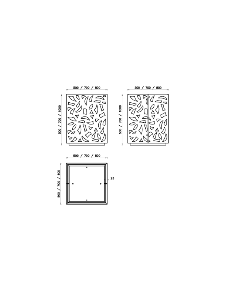 Fioriera di desing in acciaio zincato e verniciato - senza contenitore interno. La fioriera è composta da una struttura esterna e, su richiesta, da un contenitore interno, entrambi realizzati completamente in acciaio. La struttura è realizzata in lamiera piegata e con fondo forato per lo scolo delle acque superflue e piovane. Nei lati sono presenti delle decorazioni ricavate durante il taglio laser della lamiera. Il fondo, anch’esso in lamiera, è saldato alle pareti e ha nella parte inferiore un telaio saldato fatto con piatto, che serve a sollevarlo da terra. Tutte le parti metalliche sono zincate e verniciate a polveri poliestere termoindurenti secondo le colorazioni RAL. Dotata di fori di scolo per l’eliminazione dell’eccesso d’acqua.
