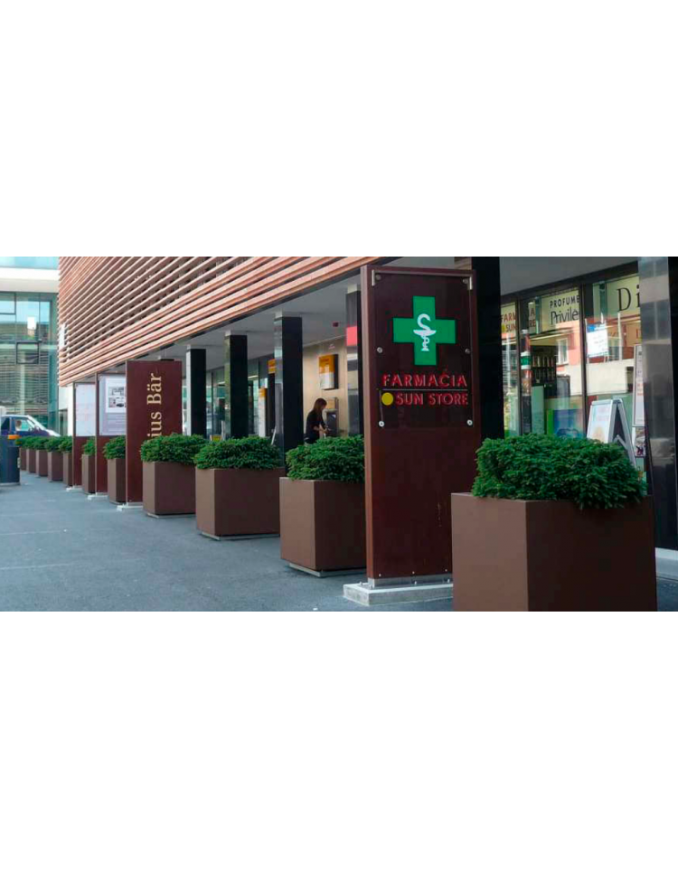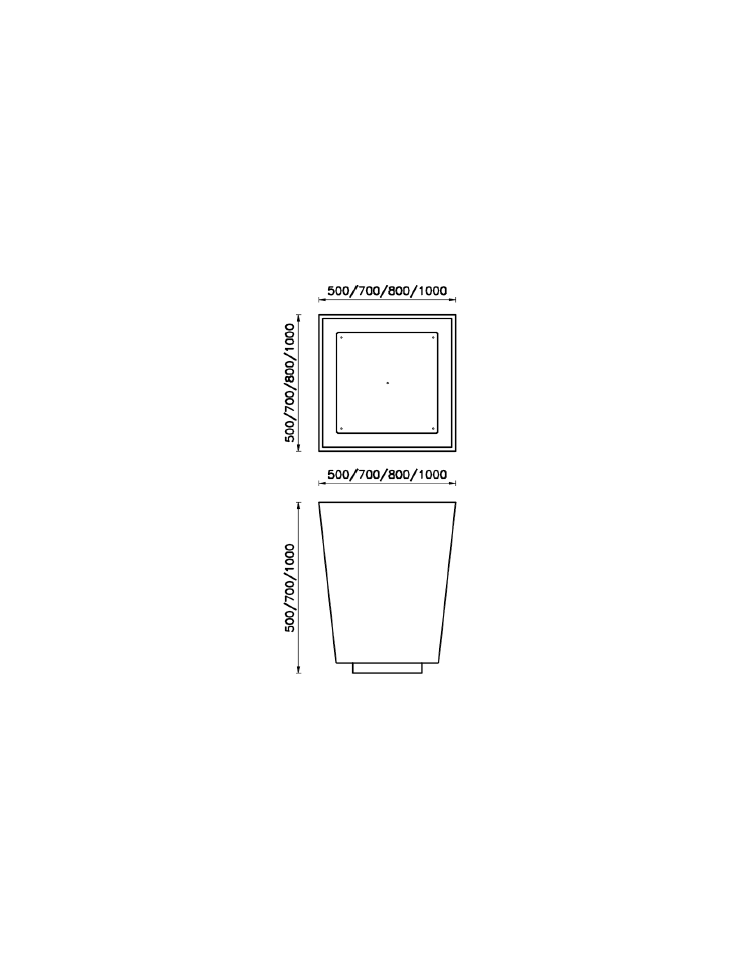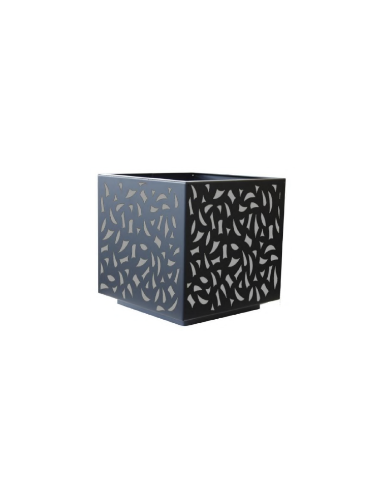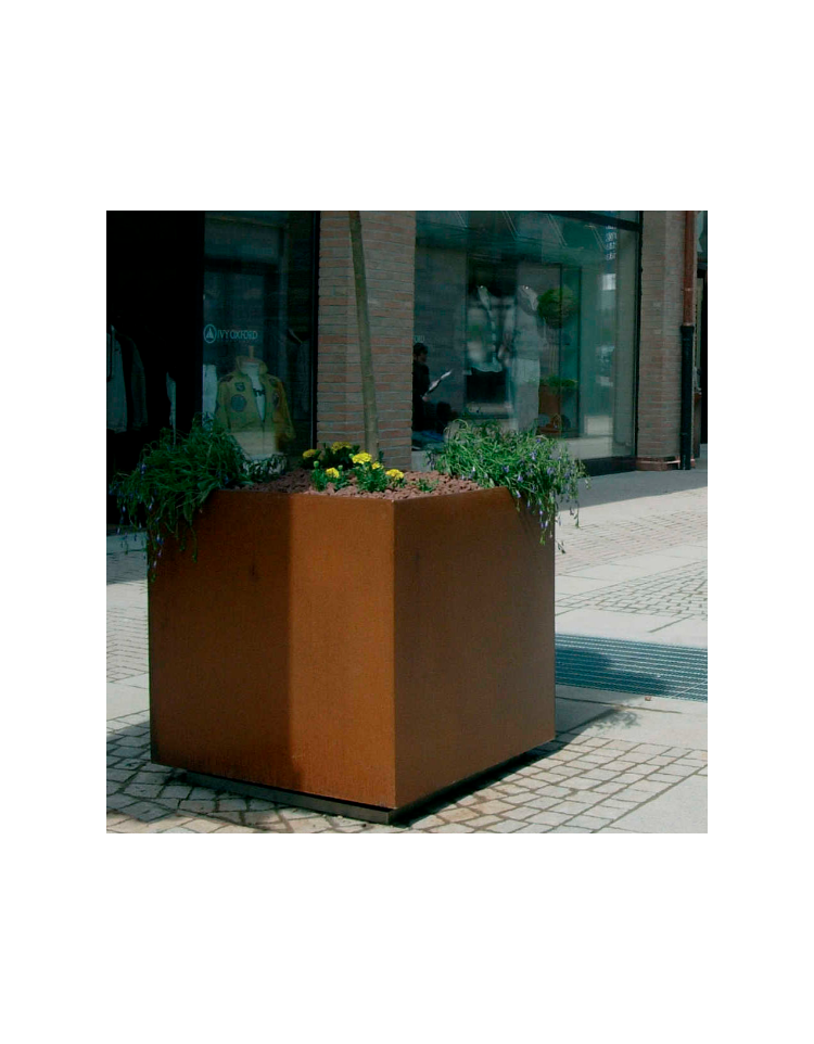 Fioriera realizzata da uno scatolato in lamiera tagliata al laser e piegata. La parte superiore è ricavata dalla piega della lamiera e crea una cornice. Il fondo in lamiera è fissato alle pareti tramite saldatura, inoltre ha saldato nella parte inferiore un quadro formato da piatto per rialzare il tutto. Il contenitore è zincato e verniciato a polveri poliestere termoindurenti secondo le colorazioni RAL. La base è in acciaio inox. Dotata di fori di scolo per l’eliminazione dell’eccesso d’acqua. Realizzata di dim. 800x800x800 mm, di forma quadra (a richiesta può essere realizzata di forma cilindrica). Molto robusta, adatta per proteggere con arbusti piazze o zone pedonali urbane.