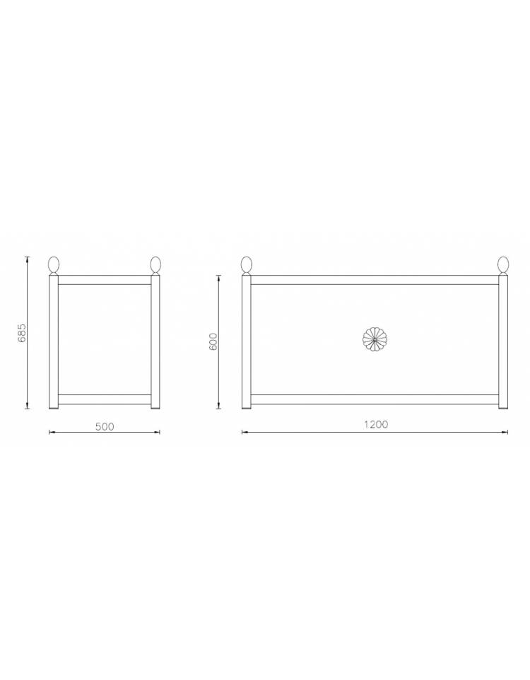 Fioriera composta da una struttura portante in tubolare quadro di acciaio con sovrastanti decori a forma di pigna. Pannellatura realizzata in lamiera con decoro centrale in ferro stampato a forma di fiore. Tutte le parti metalliche sono zincate secondo le normative UNI e verniciate a polveri poliestere termoindurenti.