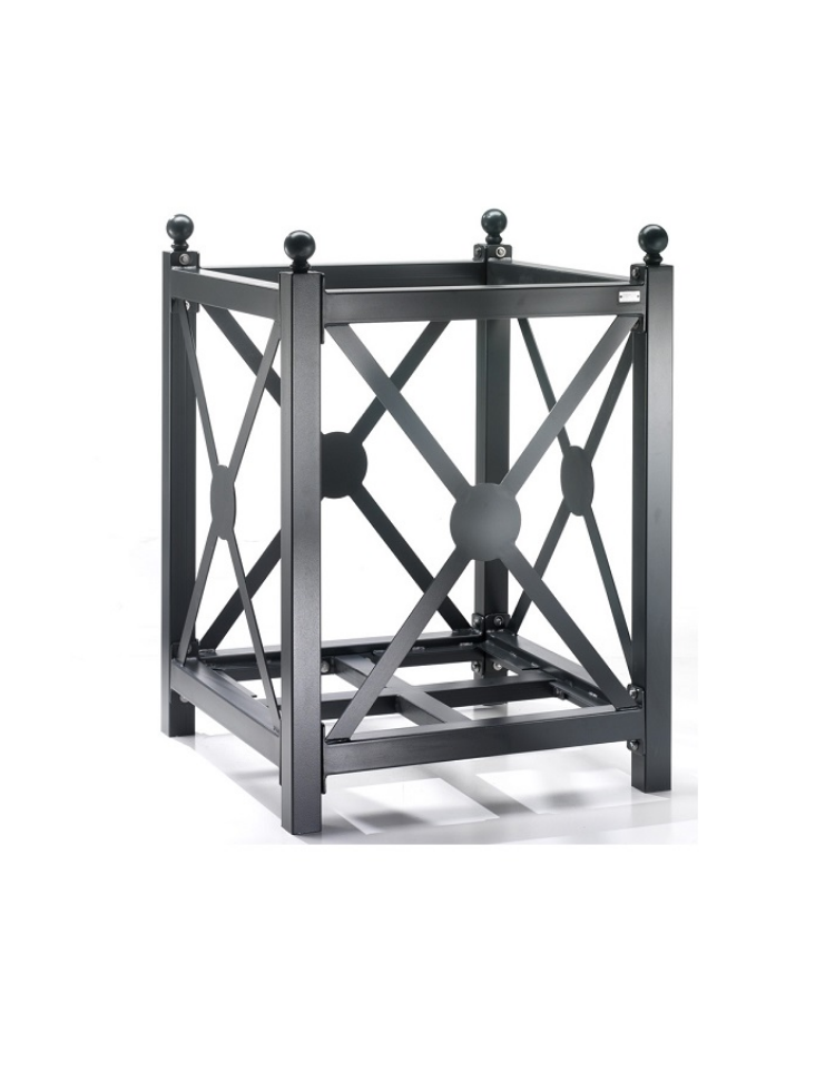 Fioriera composta da una struttura portante in tubolare quadro di acciaio con sovrastanti borchie e sfere in acciaio forgiato. Pannellatura realizzata da telaio perimetrale in tubolare quadro e crociera in piatto, con nodo centrale in tondo pieno. Tutte le parti metalliche sono zincate a caldo secondo le normative UNI e verniciate a polveri poliestere termoindurenti. Elementi strutturali collegati tramite staffe in acciaio e viteria in acciaio inox che permettono di realizzare una solida unione tra gli elementi e di ottimizzare eventuali interventi di manutenzione. Vasca interna in lamiera di alluminio mandorlata con elementi in angolare d’acciaio come rinforzi interni dotata di fori di scolo per l’eliminazione dell’eccesso d’acqua.
