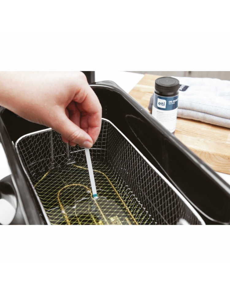 Flacone con 100 strisce reattive e tabella colori di facile lettura. Immergere la fascia colorata della striscia nell’olio (max. 40°C) per 2 secondi, quindi rimuoverla e attendere 2 minuti. Confrontare la striscia con la tabella colori.