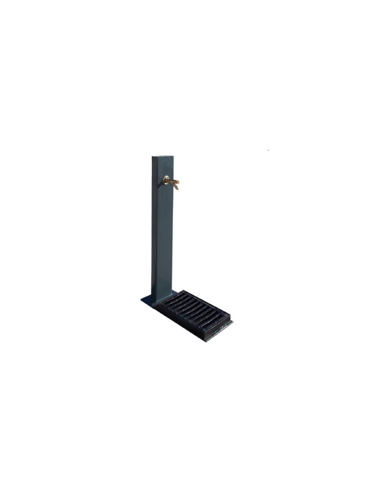 Fontana costituita da una struttura in tubolare d’acciaio rettangolare. Chiusa nella parte superiore da un tappo in acciaio fissato con due viti per poter essere rimosso con facilità per le operazioni di installazione e manutenzione del rubinetto. Alla base è saldata una piastra quadrata predisposta con 4 fori per poter fissare la struttura al suolo con tasselli ad espansione. Tutte le parti metalliche sono zincate e verniciate a polveri poliestere termoindurenti. Il rubinetto in ottone nichelato è del tipo a pulsante frontale con molla di ritorno. Normalmente chiuso e raccordato alla tubazione in acciaio inox con terminale filettato 1/2″ per l’allacciamento alla rete idrica. La caditoia interamente in ghisa verniciata è composta da due pezzi: un telaio da inghisare al suolo (o alla sommità di un sifone di raccolta acqua) e una griglia asportabile per consentire una facile pulizia.