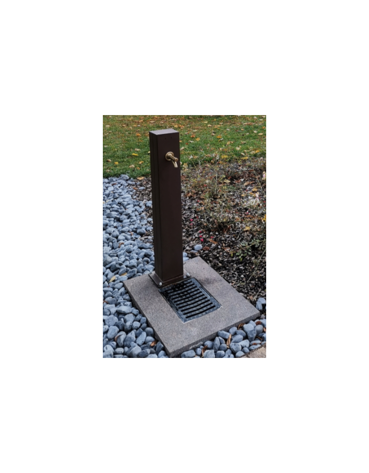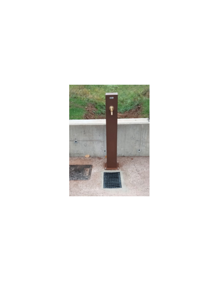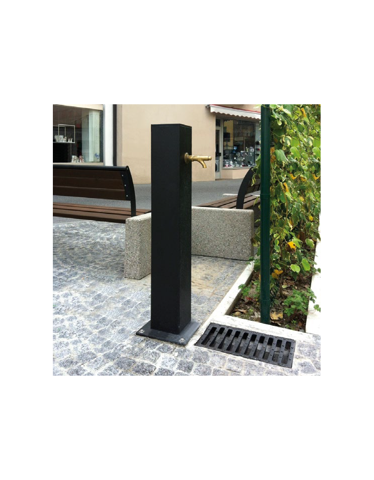 Fontana costituita da una struttura in tubolare d’acciaio quadro chiusa nella parte superiore da un tappo in acciaio fissato con due viti per poter essere rimosso con facilità per le operazioni di installazione e manutenzione del rubinetto.