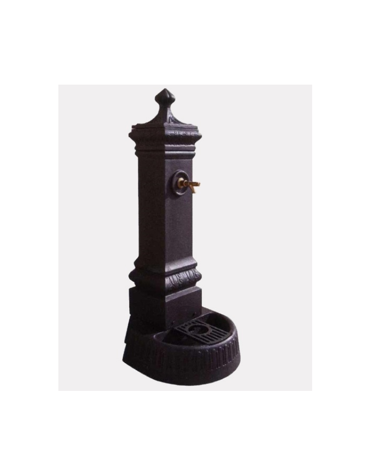 Fontana in ghisa completa di rubinetto in ottone del tipo a leva oppure a pulsante, costituita da un corpo prismatico a sezione quadra con rilievi decorativi orizzontali chiuso alla sommità da una piastra bullonata e da un pomo ornato e corredato alla base da una vasca di forma semicircolare munita di griglia superiore per l’appoggio.