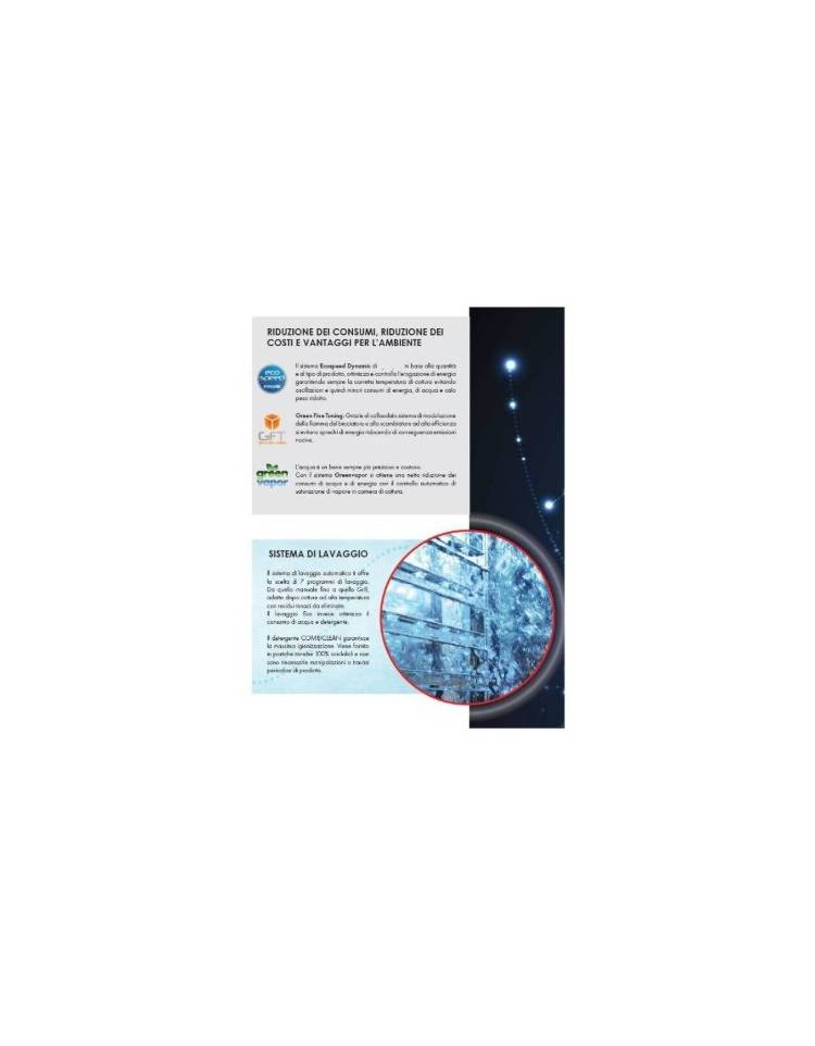 • Sistema di generazione del vapore di tipo diretto in camera di cottura tramite iniezione d’acqua direttamente sul ventilatore e nebulizzazione sugli elementi riscaldanti. Vantaggio: disponibilità immediata di vapore in camera di cottura.