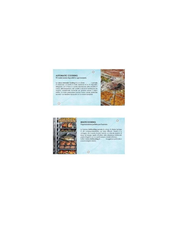 • Modalità manuale con tre modalità di cottura ad avvio immediato: convezione da 30°C a 270°C, vapore da 30°C a 130°C, combinato convezione + vapore da 30°C a 270°C.