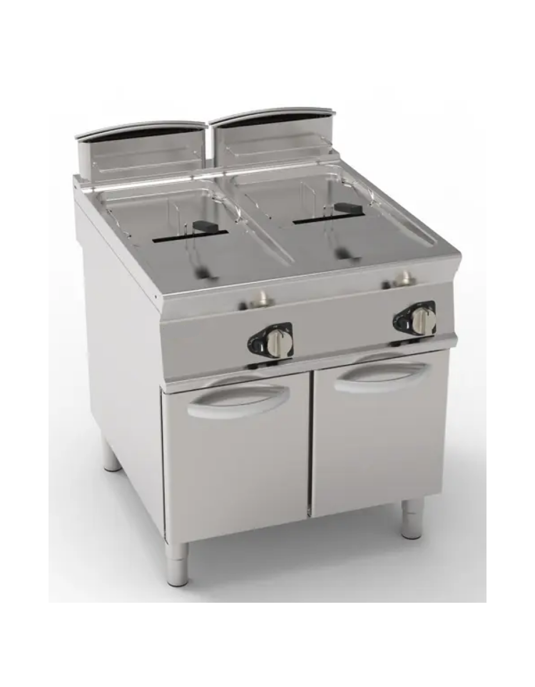 Friggitrice a gas con mobile in acciaio inox - 2 vasche da Lt 8+8 con scambiatori di calore in vasca - cm 40x90x90h