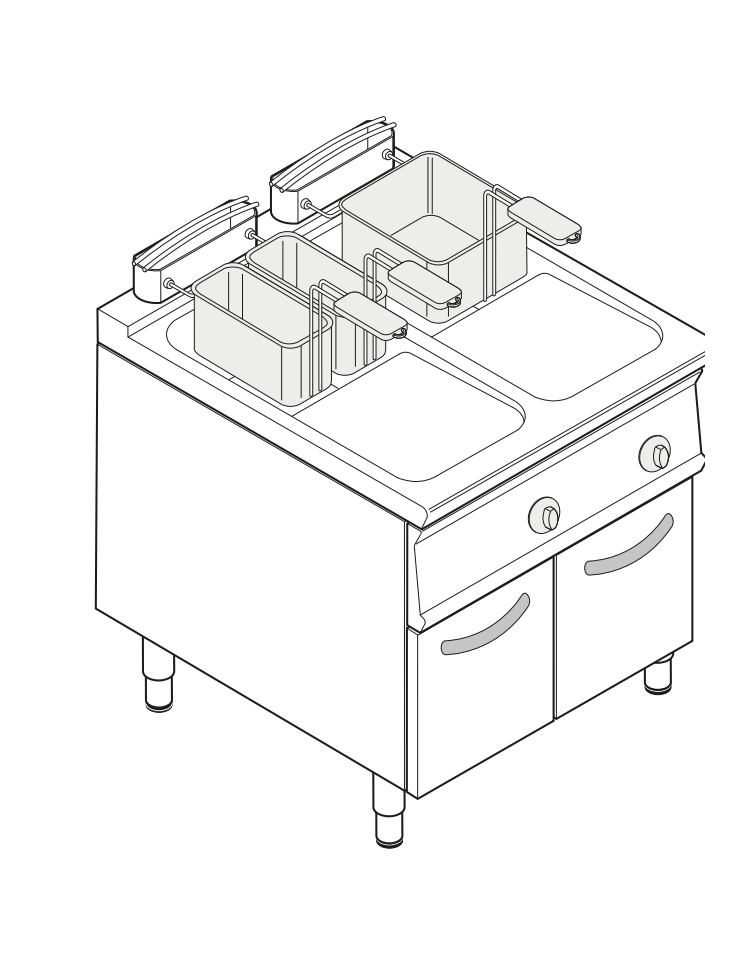 Friggitrice a gas da 17 +17 L su vano chiuso da 80 cm, 2 vasche con scambiatori di calore in vasca che assicurano una maggiore resa energetica.