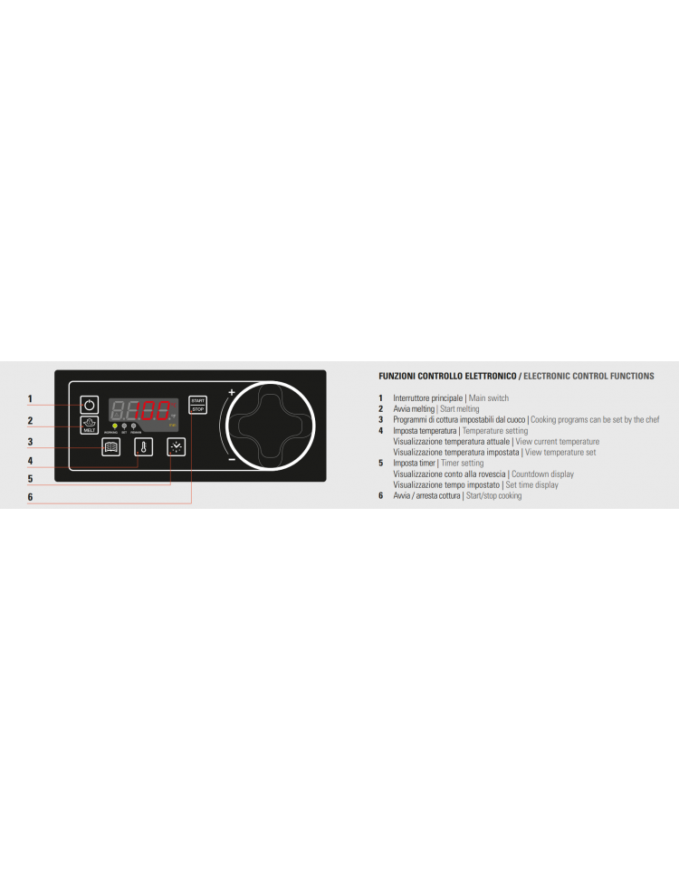 Termostato di lavoro con regolazione da 100°C fino alla temperatura massima di 190 °C al di sotto del punto di fumo dell'olio.