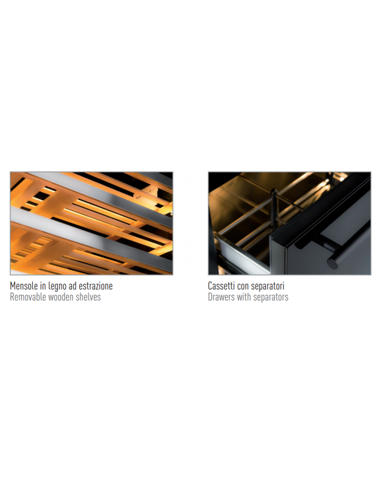 Capacità bottiglie (cl.75): 72 bottiglie vano superiore, 69 vano inferiore