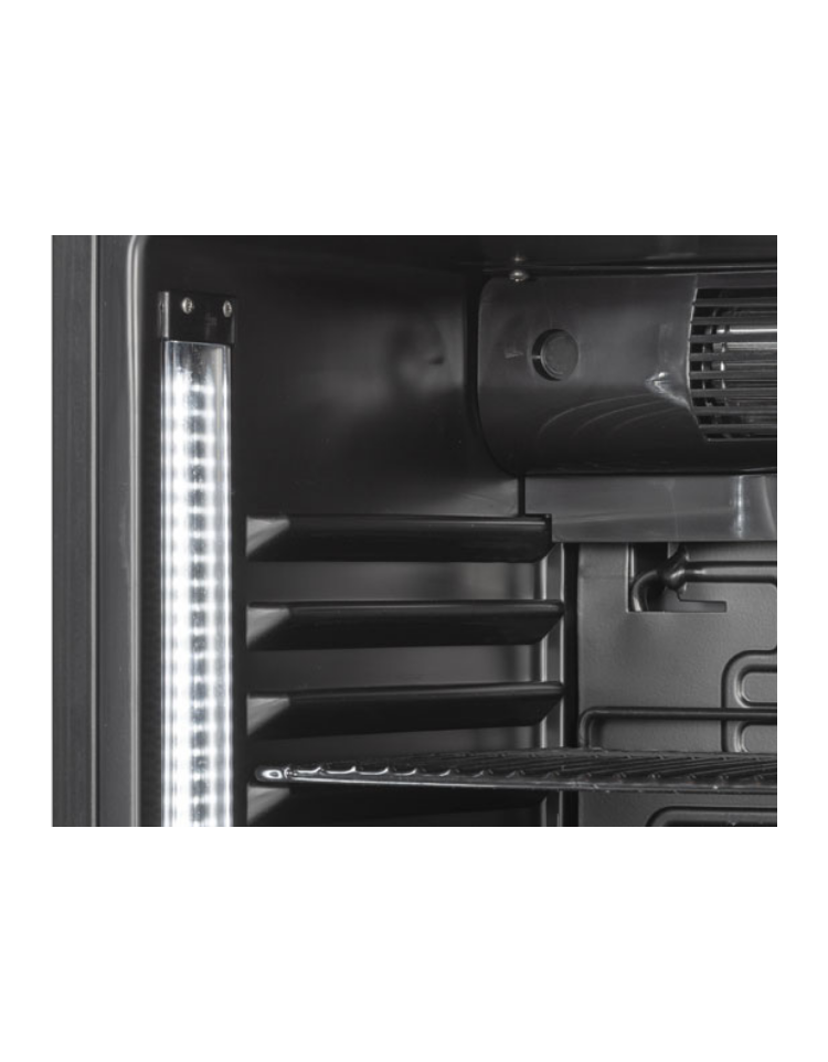 Frigobar con porta in vetro - esterno in lamiera verniciata nera - refrigerazione Roll-Bond con ventilatore - cm 48,8x50,6x84h