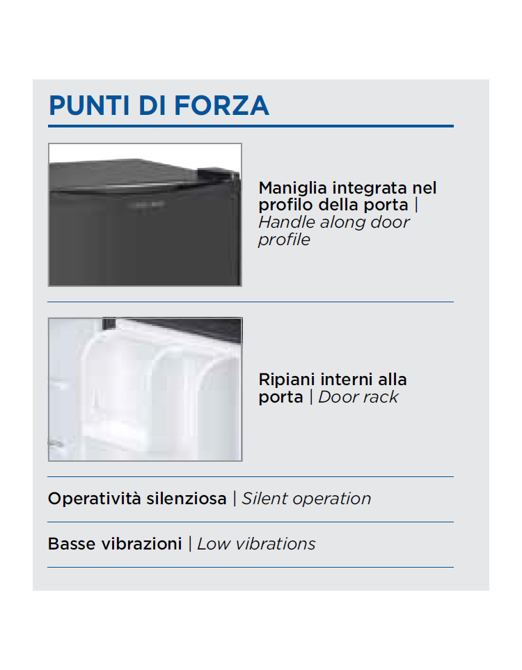 Il modello è un nuovo frigobar ad assorbimento, ideale per le camere d‘albergo, con funzionamento silenzioso e basse vibrazioni. Con una capacità di 40 litri, questo minibar è equipaggiato con luce interna a LED, serratura, ripiano porta, ripiano regolabile e maniglia lungo il profilo dell´anta.