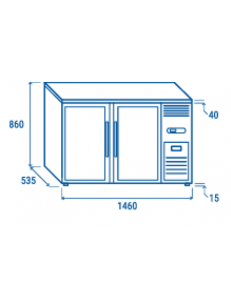 Frigorifero sottobanco per bibite, 2 porte a battente con motore laterale - Refrigerazione ventilata +2°/+8°C - cm 146x53,5x86h
