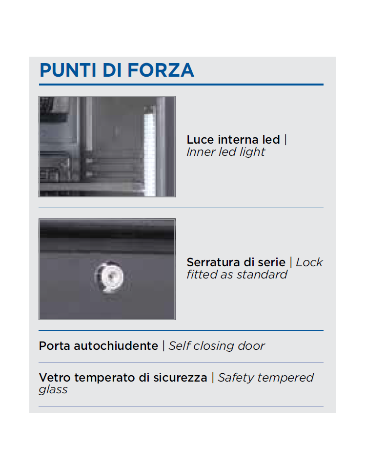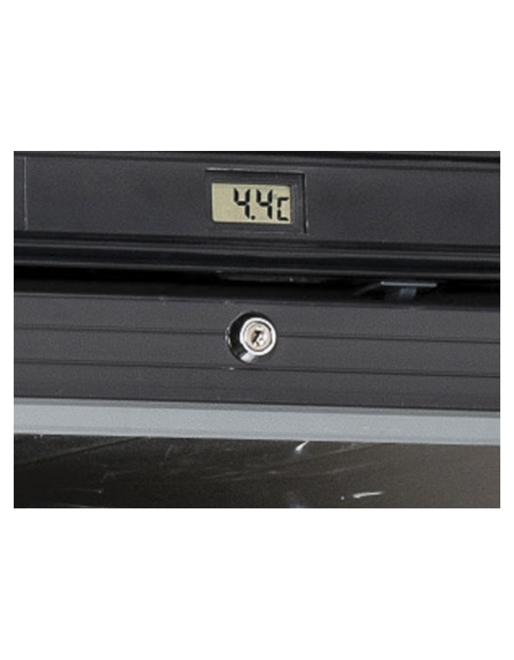 Il modello è stato progettato per essere una vetrina refrigerata per bevande affidabile e versatile, ideale per esporre e mantenere alla giusta temperatura qualsiasi tipo di bottiglia e lattina. Con una capacità di 350L, di colore nero e con maniglia esterna rettangolare in alluminio, questo prodotto è equipaggiato con luce interna verticale, serratura, termometro digitale, 5 ripiani regolabili, porta autochiudente e doppio vetro temperato di sicurezza.