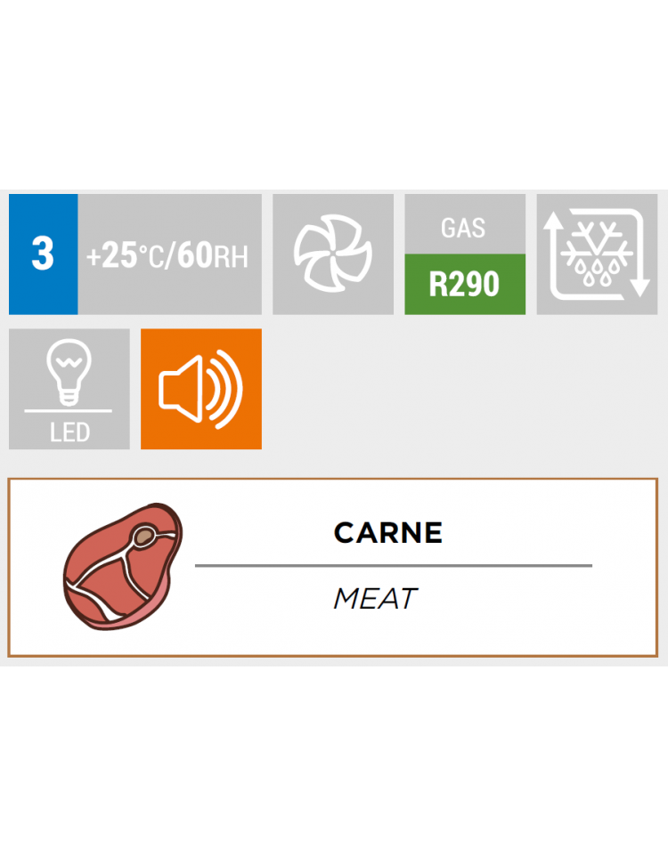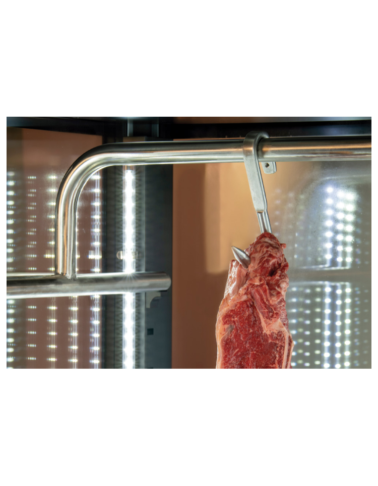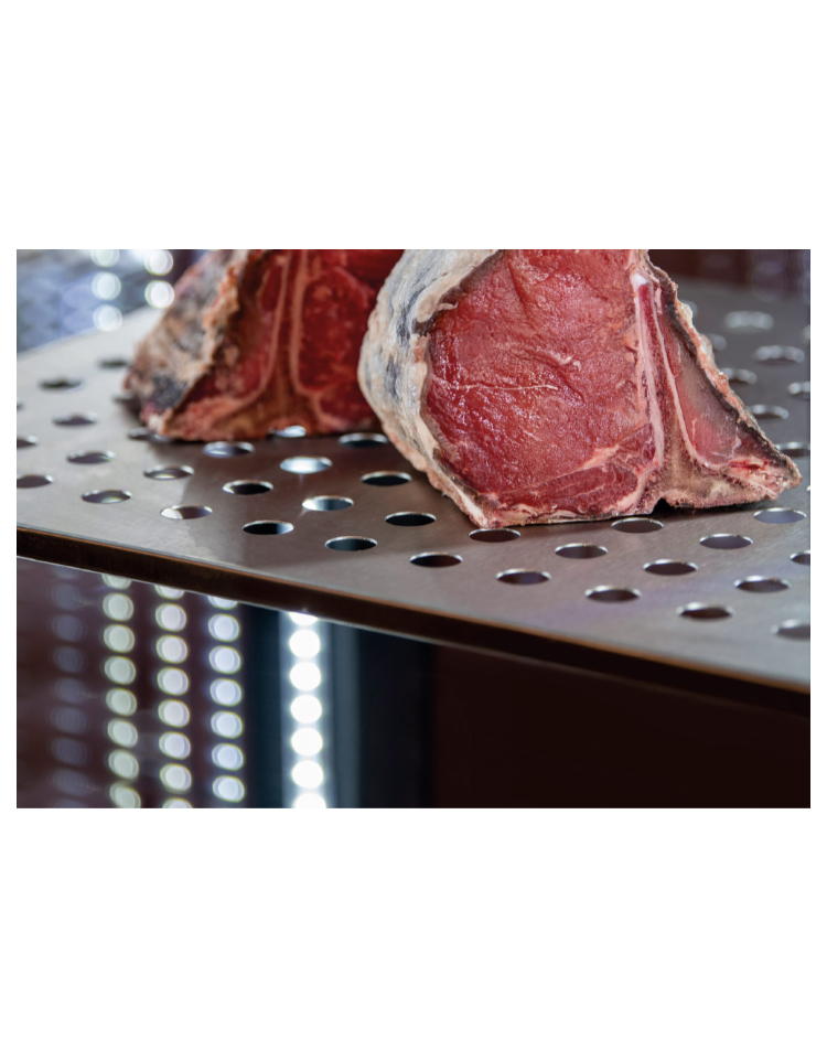 La vetrina per maturazione carne riesce a catturare lo sguardo del visitatore grazie alla sua raffinatezza, e allo stesso tempo è in grado di adattarsi a qualsiasi contesto grazie alla sua discrezione. Questo modello con porta singola da 900mm, è disegnato per valorizzare i prodotti esposti al suo interno grazie ai 4 lati in vetro panoramico con serigrafia nera, ai 2 ripiani in metallo + barra appendi salumi e alle 4 luci interne a LED di colore rosa. In classe energetica A, dotata di termostato digitale con connessione Wi-Fi che consente di monitorare e regolare la temperatura interna da smartphone o tablet.
