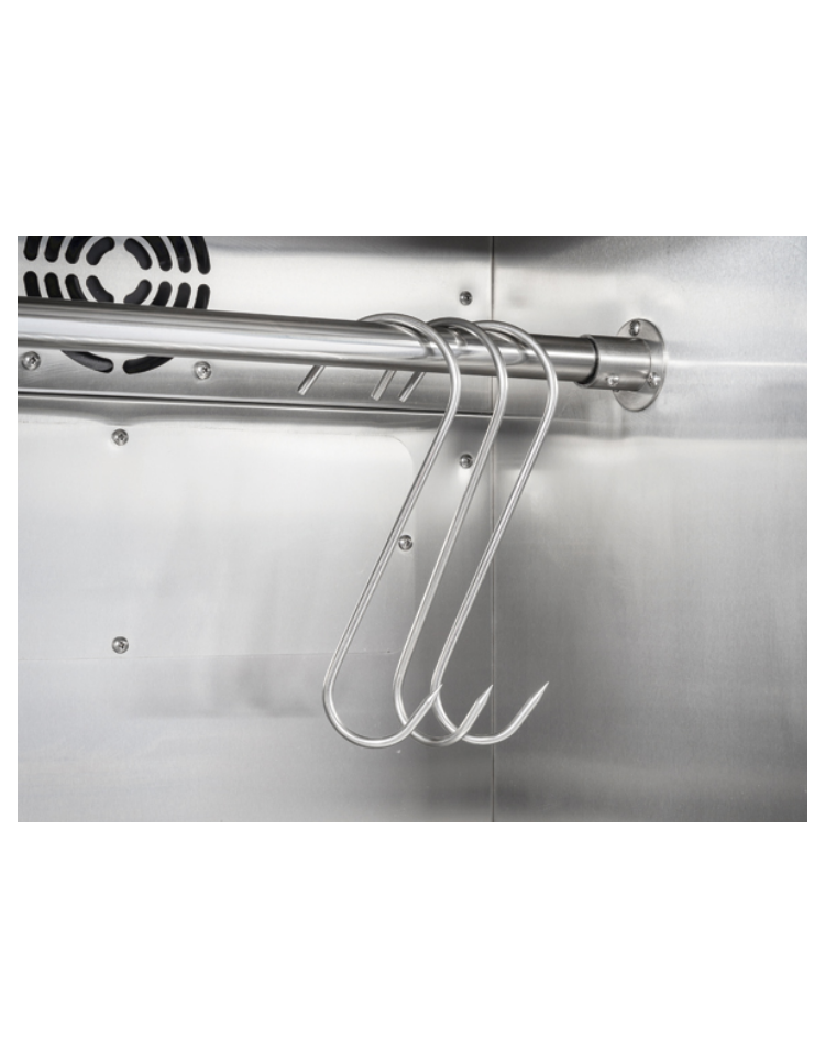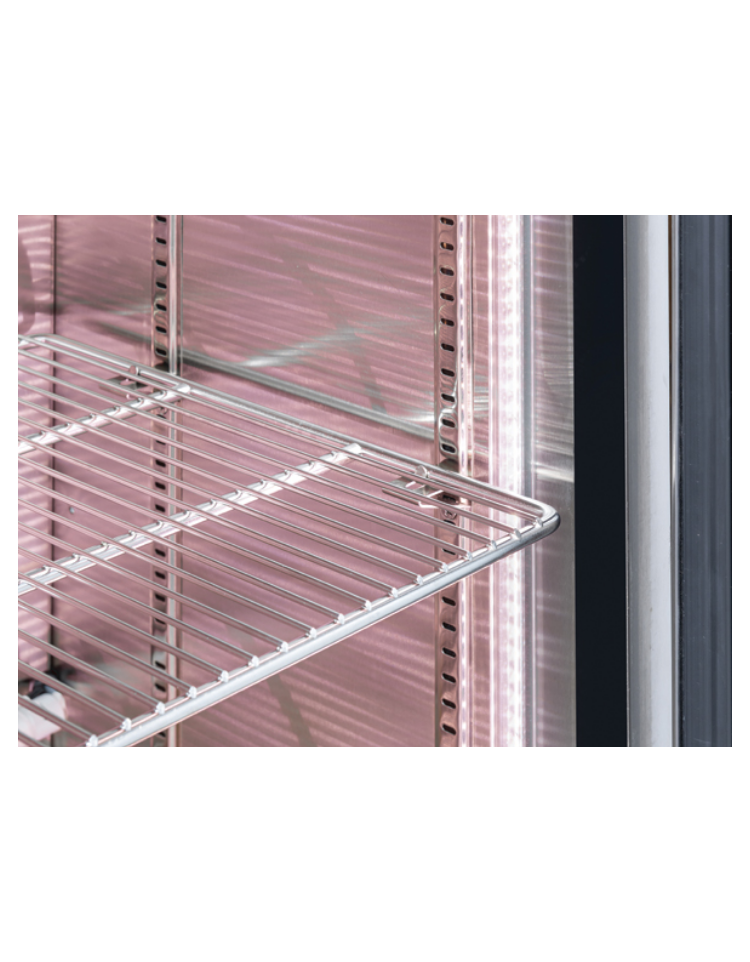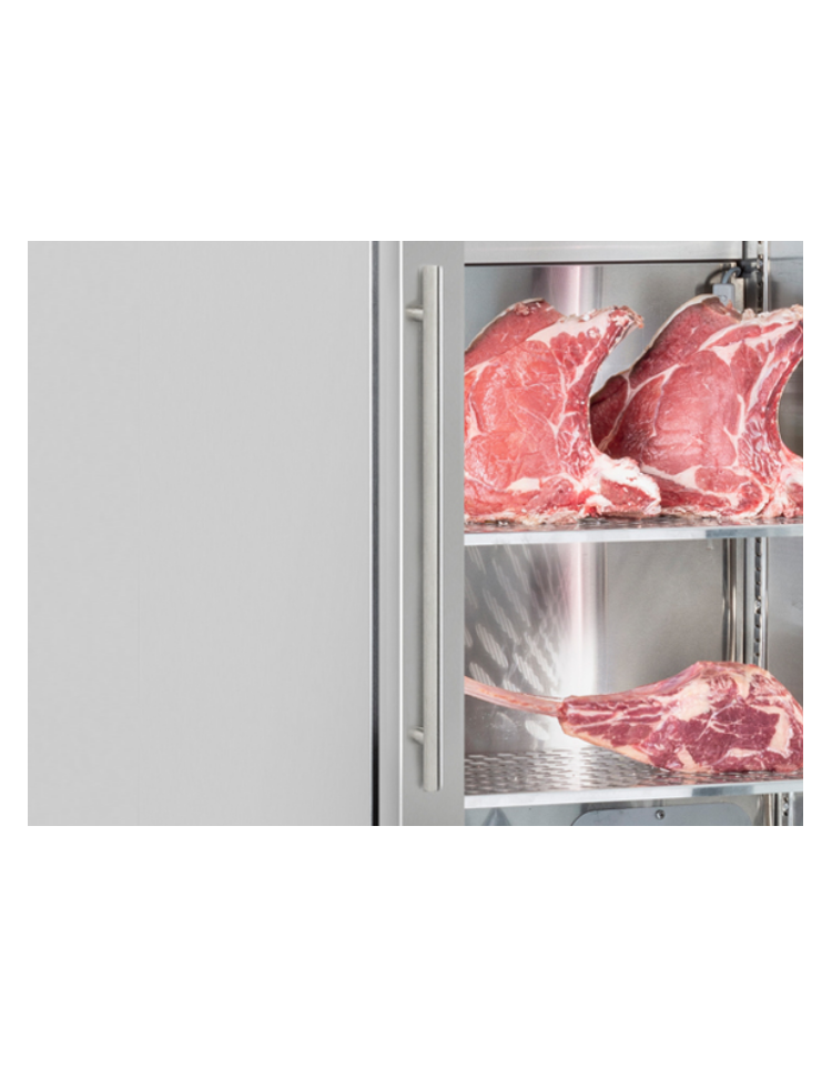 Il modello è stato progettato per essere un frollatore per carni affidabile e versatile, ideale per esporre e mantenere alla giusta temperatura qualsiasi tipo di carne. Con una capacità di 448 litri, rifinito in acciaio inox all’esterno e con acciaio inossidabile a specchio all’interno, questo prodotto è equipaggiato con porta a vetro con telaio in acciaio inox e maniglia cilindrica verticale, display digitale, 6 ripiani cromati regolabili, 6 ganci per carne, doppia luce LED verticale interna (colore rosa), porta autochiudente e serratura di serie.