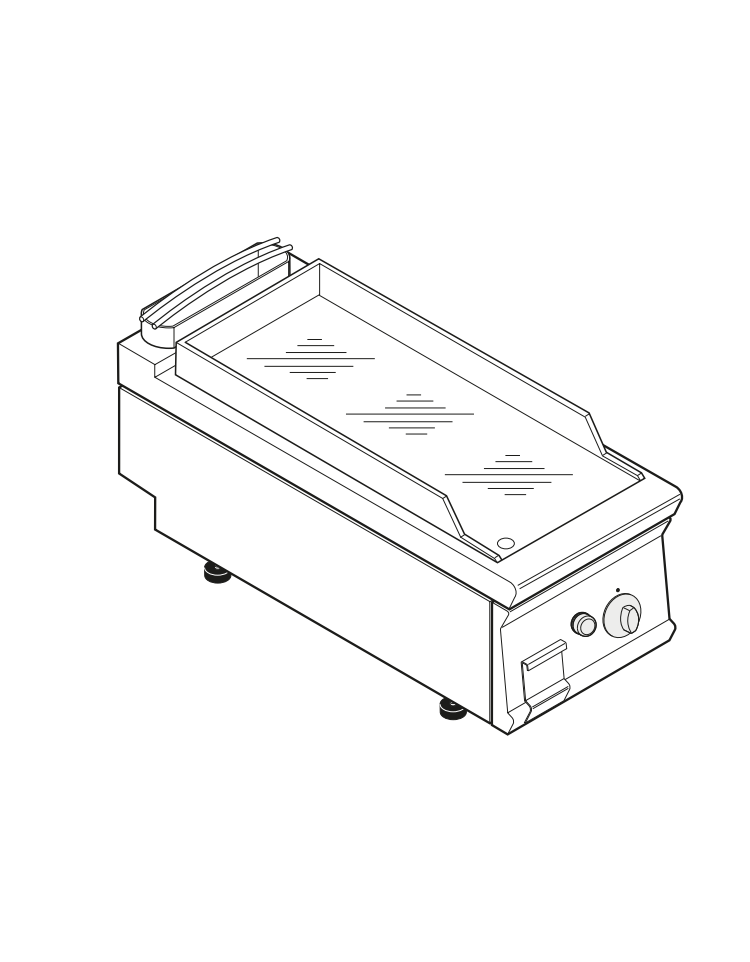 Piano di lavoro stampato al quale è saldata emerticamente la piastra di cottura incassata con ampia zona di cottura con angoli arrotondati per la massima igiene e facilità di pulizia.