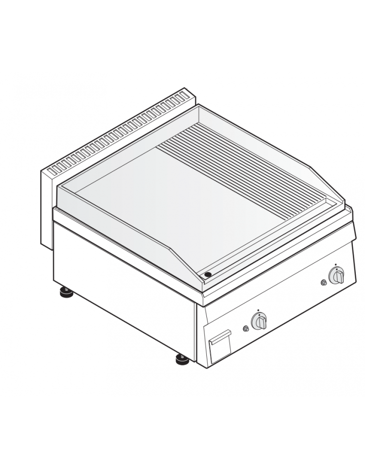 Fry-top a gas, versione top da 70 cm, con piastra di cottura 2/3 liscia e 1/3 rigata in acciaio.