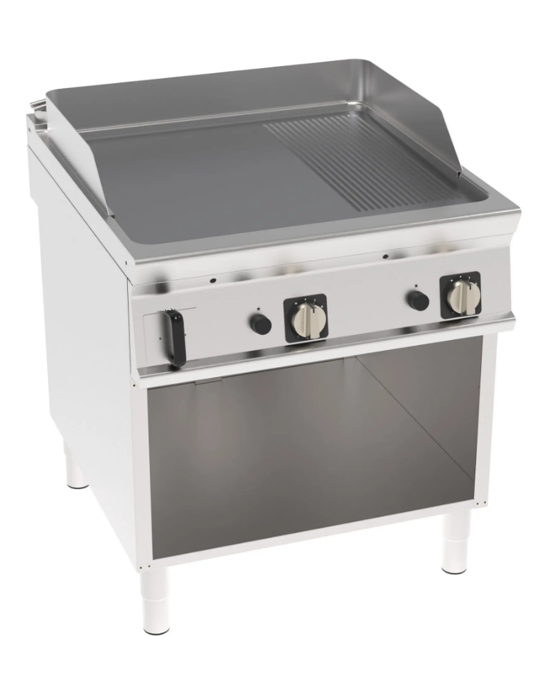 Fry top gas, piastra 2/3 liscia 1/3 rigata cromata, su vano con porte