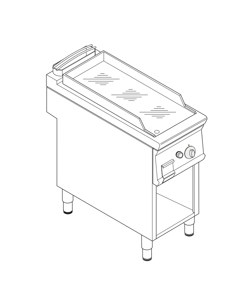Fry-Top a gas su vano aperto, 1 zona cottura, piastra liscia cromata cm 34,9x69,8, potenza gas Kw 8 - cm 40x90x90h