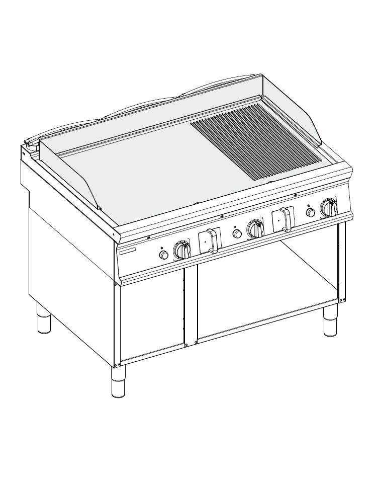 Fry-Top a gas su vano aperto, 2/3 liscio + 1/3 rigato cromato spazzolato, piano cottura cm 113x69 - gas Kw 24 - cm 120x90x90h