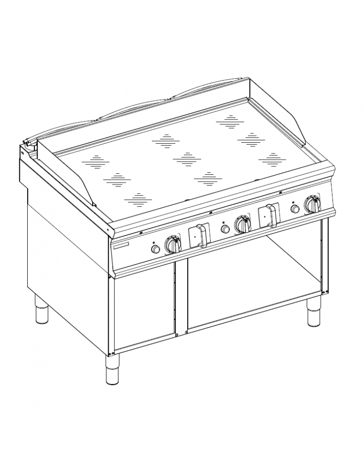 Fry-top a gas freestanding su vano aperto da 120 cm con piastra di cottura liscia cromata a specchio raccomandato soprattutto per la cottura di prodotti delicati.