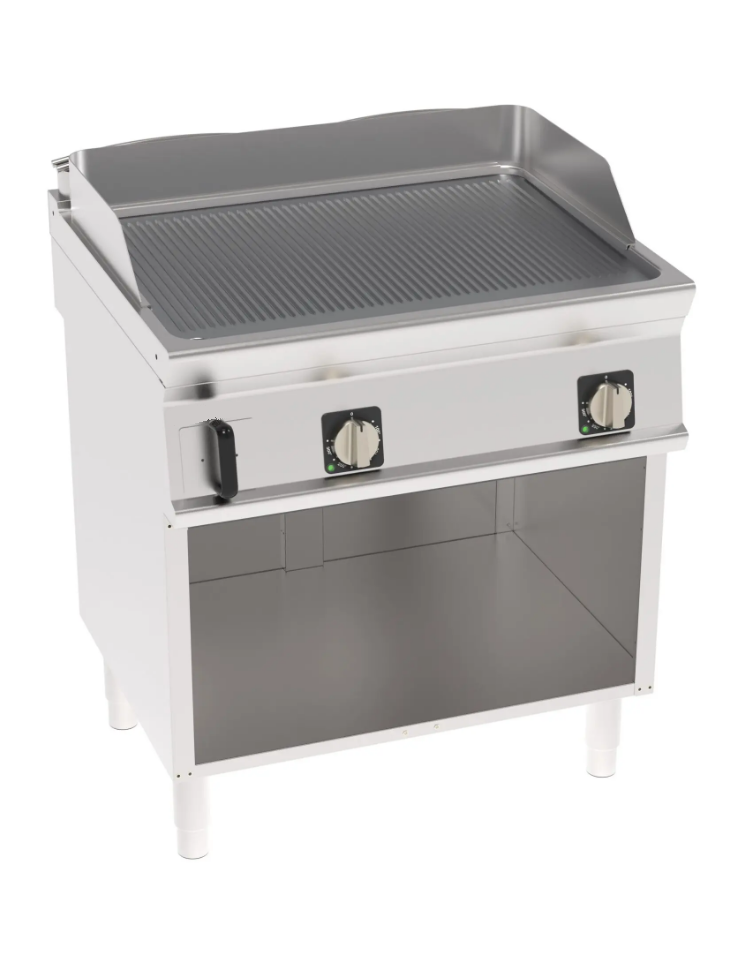 Fry-top elettrico freestanding su vano aperto da 80 cm con piastra di cottura rigata cromata spazzolata che permette di cuocere una miriade di prodotti diversi: dalla carne al pesce e verdure.