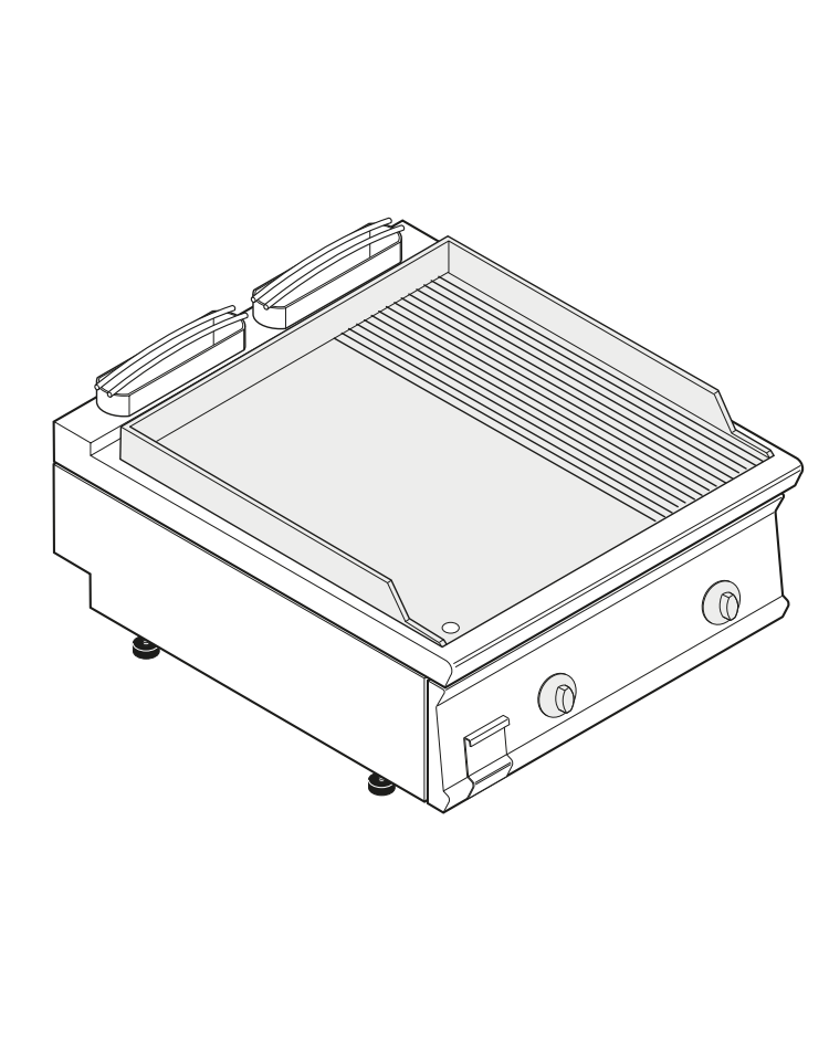 Piastra di cottura dello spessore di 15 mm e inclinata per favorire il drenaggio di grassi e liquidi.