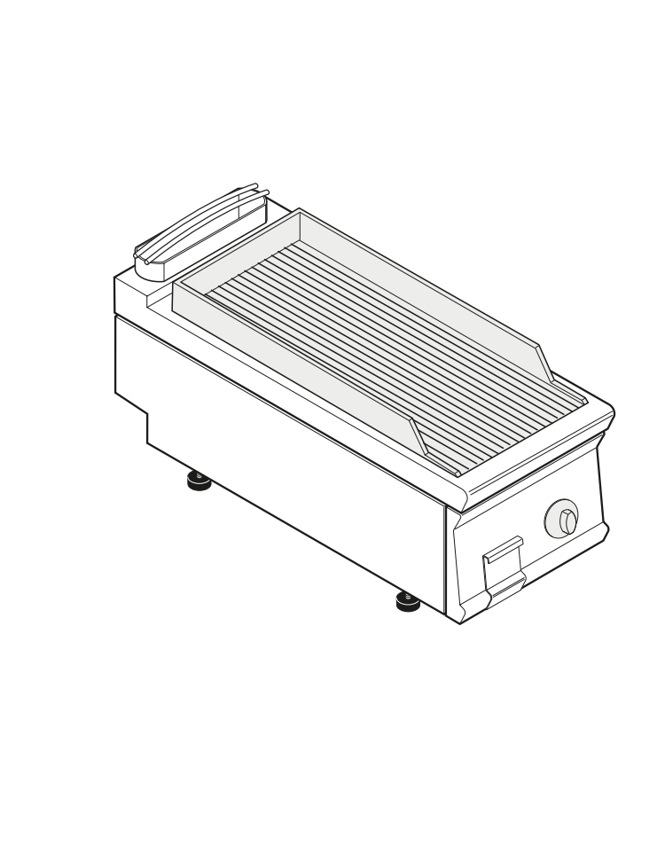 Piastra di cottura dello spessore di 15 mm e inclinata per favorire il drenaggio di grassi e liquidi.