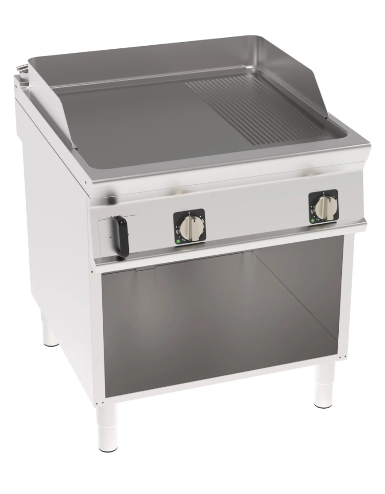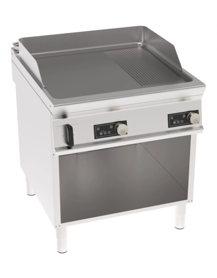 Fry-top elettrico su mobile a giorno*, per uso professionale. Dotato di piastra liscia e rigata, normale. Piastra normale in acciaio