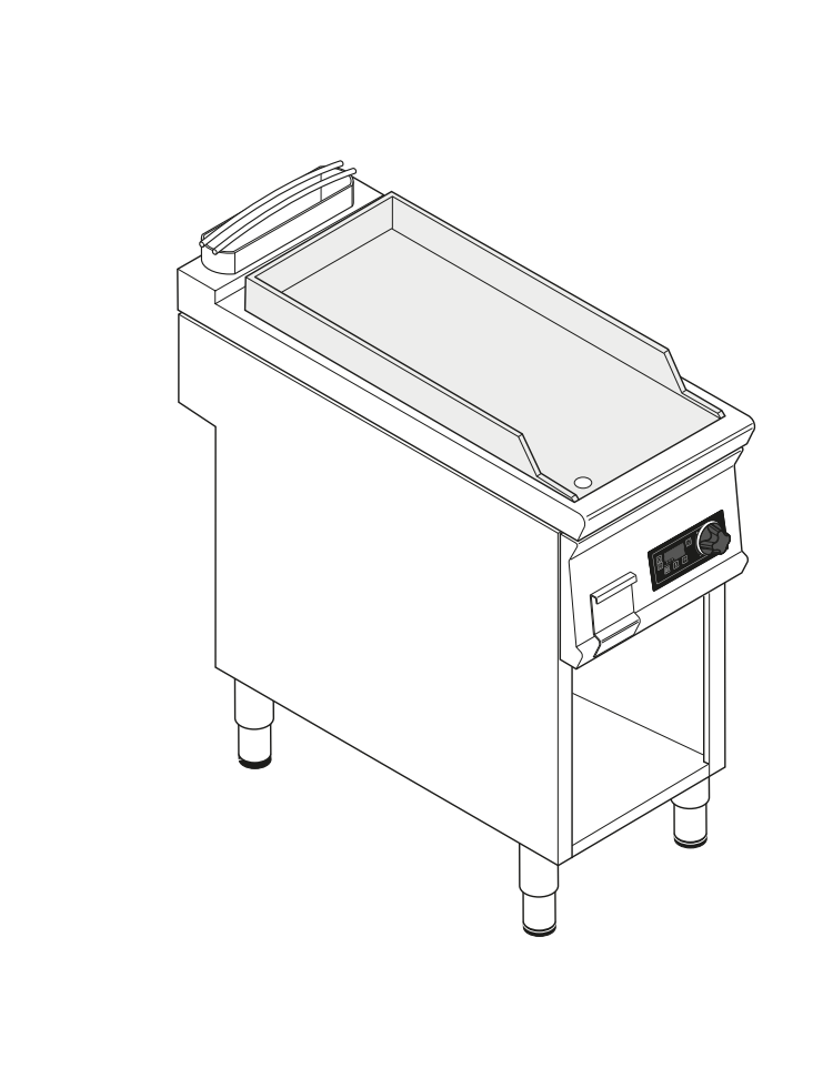 Fry-top elettrico con controllo elettronico versione freestanding su vano aperto da 40 cm con piastra liscia in acciaio.