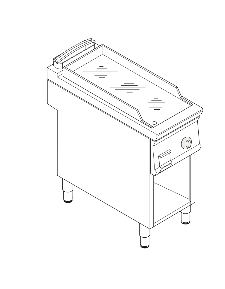 Piano di lavoro stampato al quale è stata saldata emerticamente la piastra di cottura incassata con ampia zona di cottura e con angoli arrotondati per la massima igiene e facilità di pulizia.