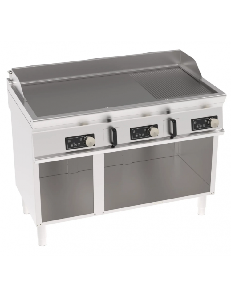 Fry-top elettrico freestanding su vano aperto da 120 cm con piastra di cottura 2/3 liscia e 1/3 rigata in acciaio.