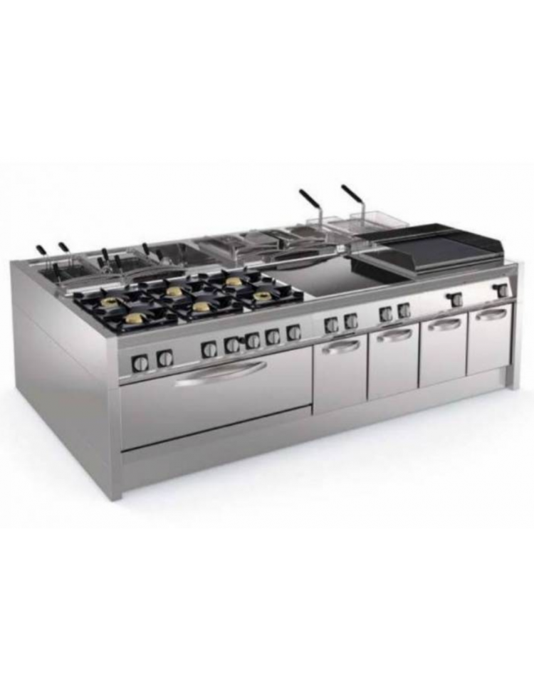 Piano di lavoro stampato al quale è stata saldata emerticamente la piastra di cottura incassata con ampia zona di cottura e con angoli arrotondati per la massima igiene e facilità di pulizia.