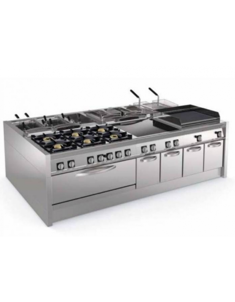 Piano di lavoro stampato al quale è stata saldata emerticamente la piastra di cottura incassata con ampia zona di cottura e con angoli arrotondati per la massima igiene e facilità di pulizia.