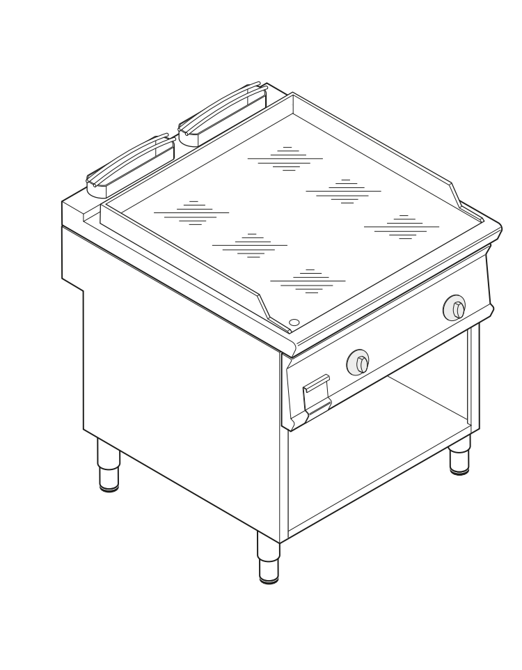 Piano di lavoro stampato al quale è stata saldata emerticamente la piastra di cottura incassata con ampia zona di cottura e con angoli arrotondati per la massima igiene e facilità di pulizia.