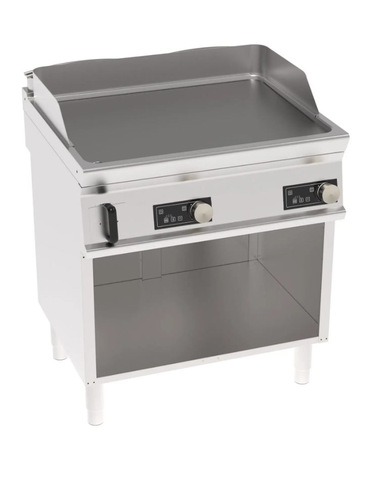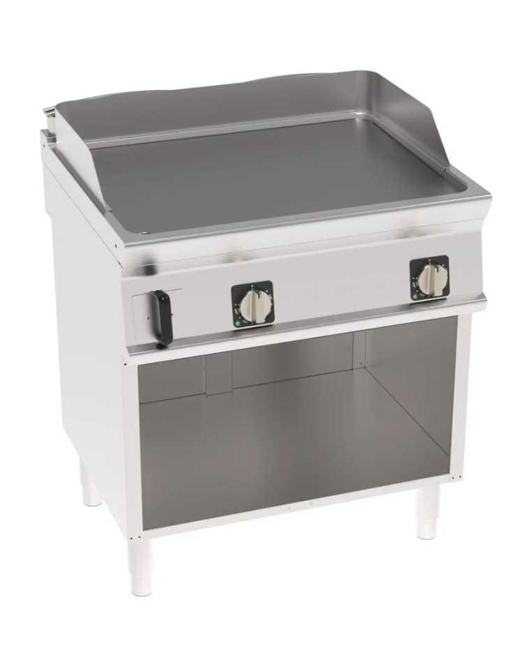 Fry-top elettrico su mobile a giorno*, per uso professionale. Dotati di piasta liscia e/o rigata, normale o cromata e vetroceramica. Piastra normale in acciaio FE430B. Piastra cromata in acciaio FE510C con finitura cromo. Hanno un doppio termostato: di lavoro e di sicurezza. Assicurano elevata resistenza, durata nel tempo e raggiungono rapidamente la temperatura desiderata con regolazione da 50 a 300 °C. Particolarmente facili e veloci da pulire. Bacinelle di raccolta liquidi capienti ed estraibili.