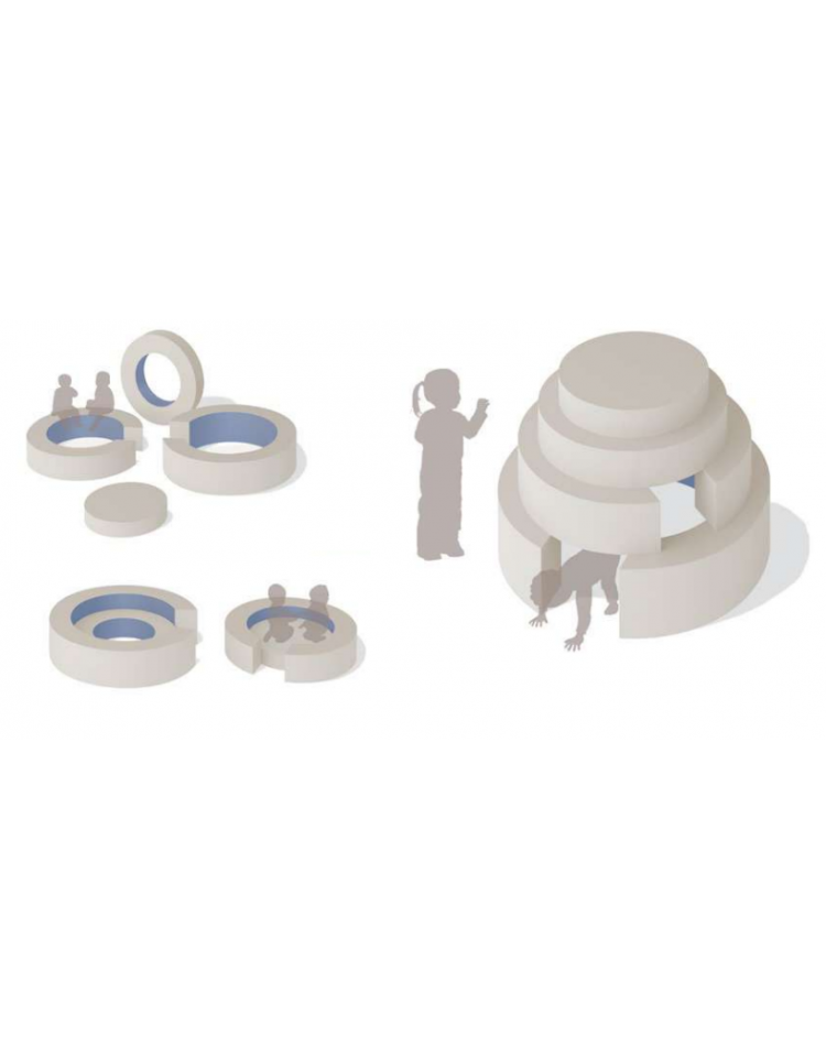 Quattro elementi circolari funzionano come sedute, isole protette, archi da attraversare, ruote. Appoggiati uno sull’altro formano l’Iglù, una tana morbida e leggera, uno spazio confortevole e sicuro, facile da montare e smontare.
