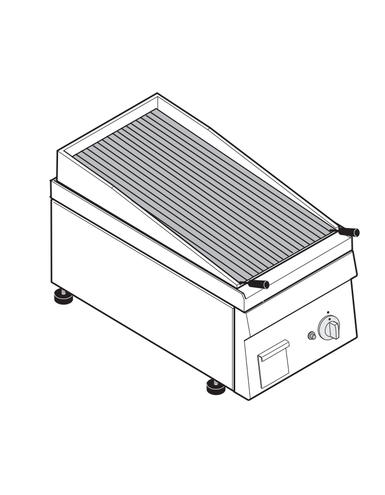 Canalino e cassetto per la raccolta di grassi, liquidi, polveri e detriti di pietra lavica. Ogni zona di cottura è dotata di un cassetto rimovibile.