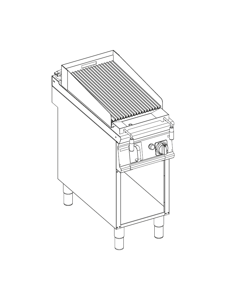 Superficie di cottura con griglie intercambiabili e con maniglia posteriore. Di serie viene fornita una griglia in acciaio inossidabile AISI304, spesssore 15/10 con profilo a S per evitare che eventuali fiamme della pietra lavica brucino i prodotti. Come accessori sono disponibili sia la griglia in ghisa porcellanata con moduli double face per la cottura di carne da un lato e pesce e verdure dall'altro, che la griglia con profilo in tondino in acciaio inossidabile AISI 304.