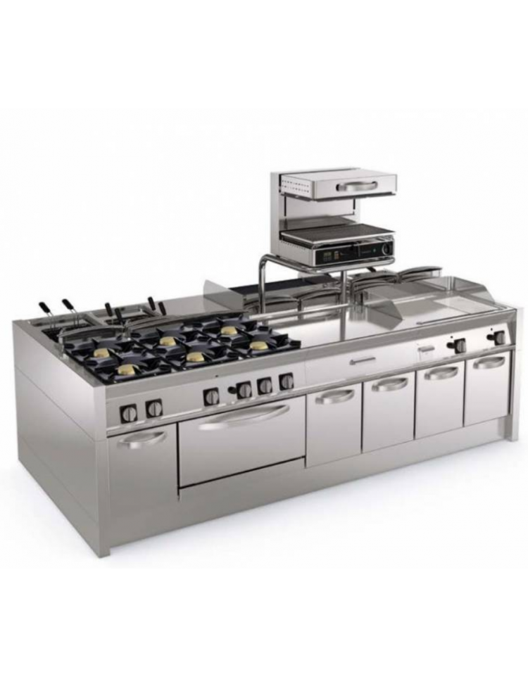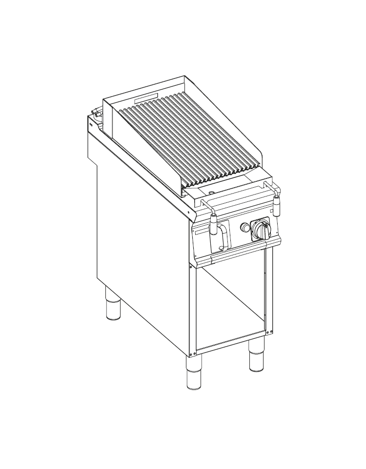 Superficie di cottura con griglie intercambiabili e con maniglia posteriore. Di serie viene fornita una griglia in acciaio inossidabile AISI304, spesssore 15/10 con profilo a S per evitare che eventuali fiamme della pietra lavica brucino i prodotti. Come accessori sono disponibili sia la griglia in ghisa porcellanata con moduli double face per la cottura di carne da un lato e pesce e verdure dall'altro, che la griglia con profilo in tondino in acciaio inossidabile AISI 304.